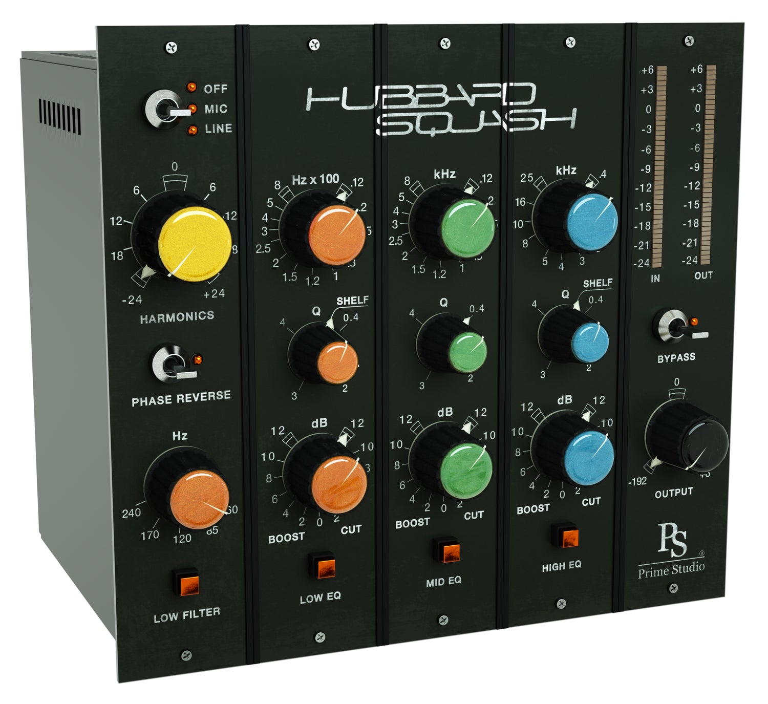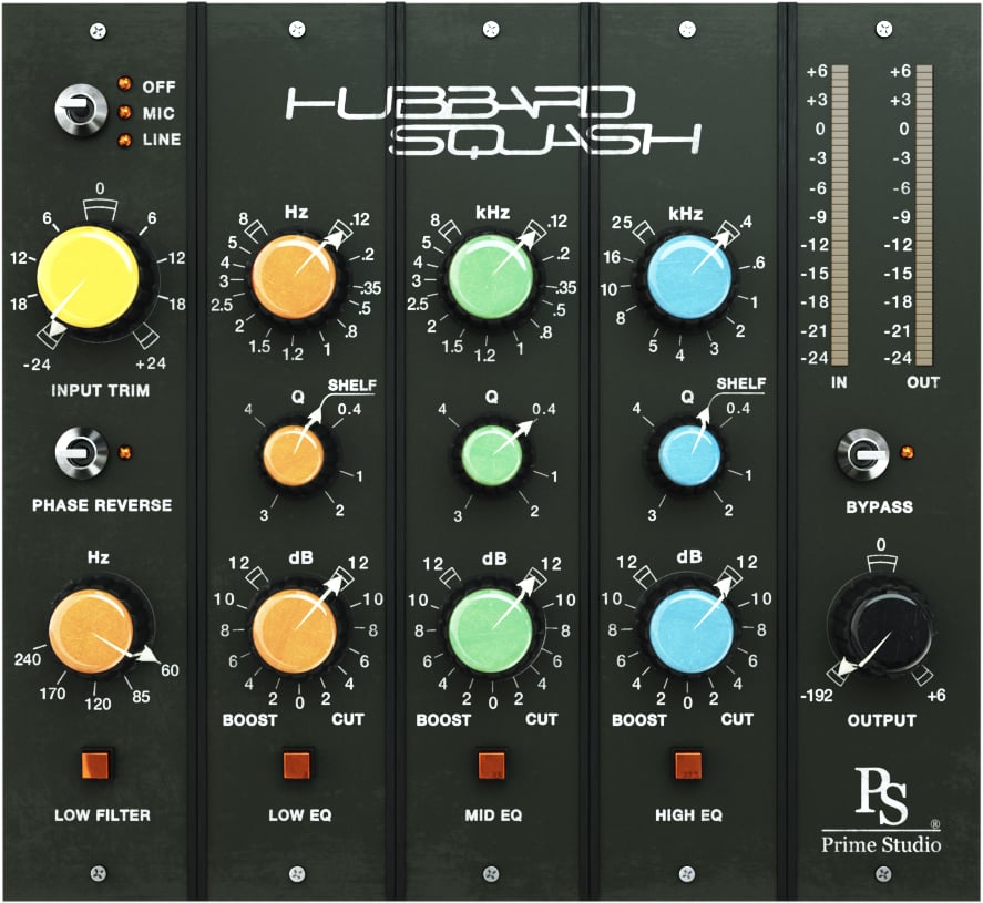 Prime Studio® Hubbard SquashSmooth, smoother, Hubbard Squash. Classic three band fully parametric stereo equalizer offering lush tone for separately engageable low, mid and high frequency bands and a low cut filter. Switch phase to taste and dial in harmonic distortion of two different preamp stages offering line or microphone preamplification tonality. For saving CPU usage you simply can also choose to switch off the preamp characteristics. Keep control of your levels using input and output metering in 80’s led style.