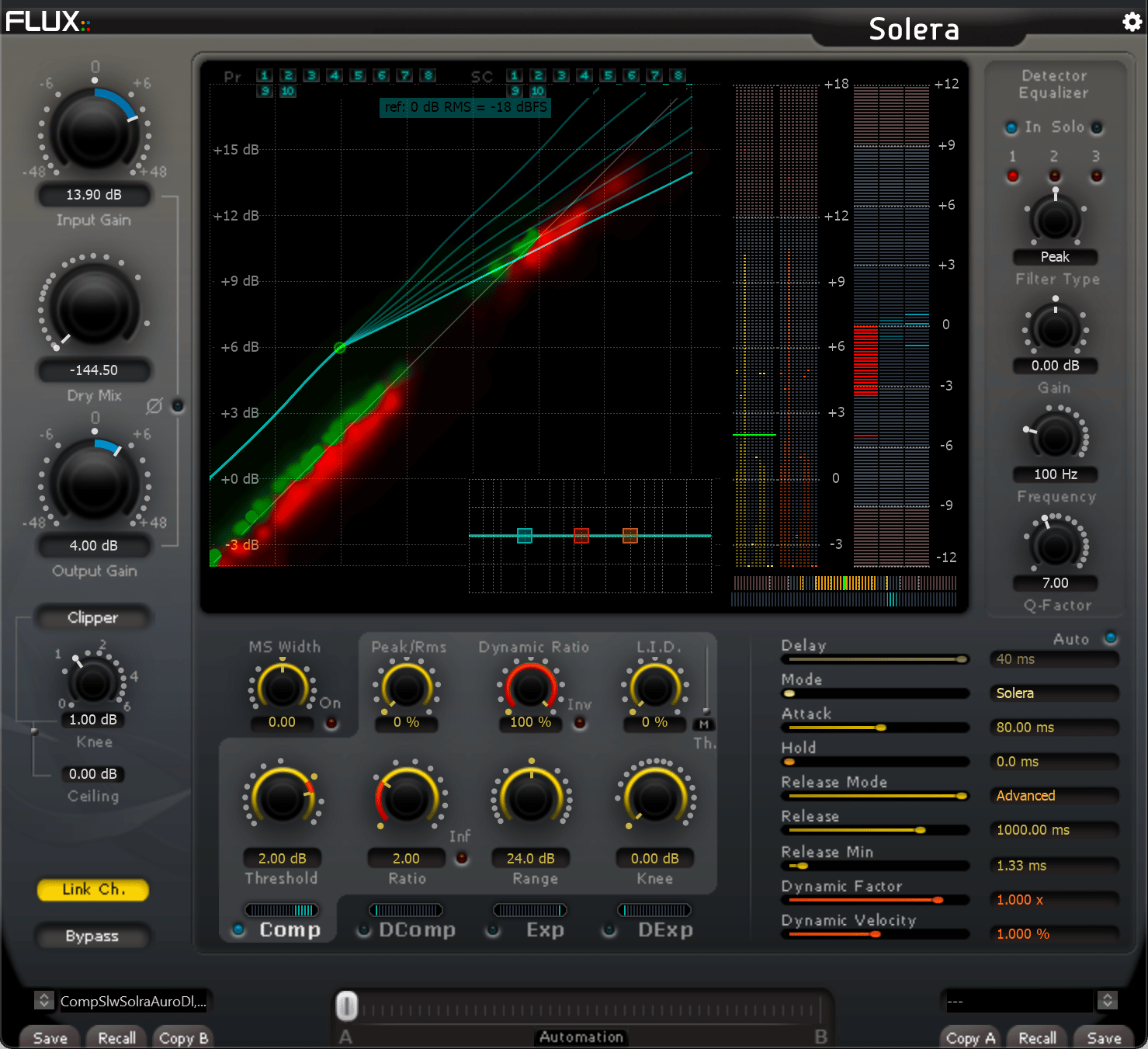 Solera is a comprehensive full-band dynamics processor that combines the power of a compressor, expander, de-compressor and de-expander, with all four processes running in parallel, designed to deliver powerful dynamics processing in any challenging situation while preserving or restoring the true natural quality of the audio material without adding any artefacts.