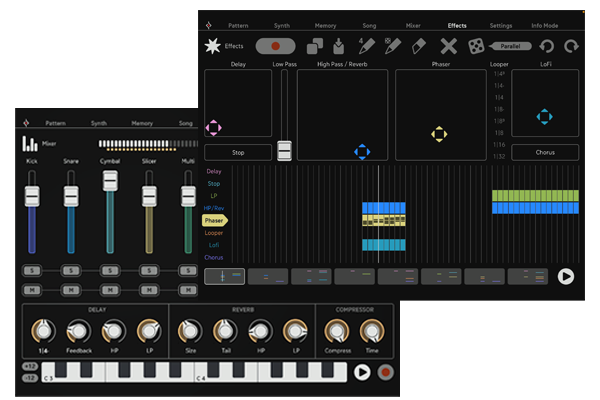 The powerful FX sequencer with eight first-class touch-controlled effects is the cherry on top of this awesome music toy. The 8 included effects TapeStop, Filter-Delay, Reverb, Looper, Phaser, Chorus, LowPass and LoFi can be triggered with the Touch controls or the FX Sequencer. Triggers and parameter changes can be recorded and edited, and FX Sequences can easily be managed on the Memory page.