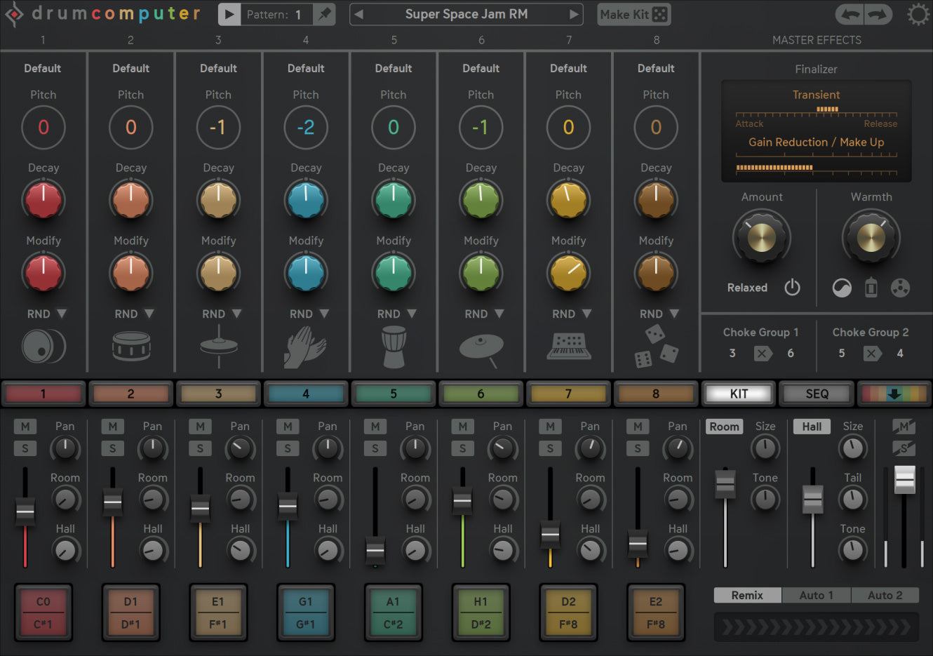 The Kit Page provides the most important functions of the sound engine. Each of the eight kit channels provides a preset browser for the individual sound, controls for global pitch and decay, a modify knob and a profiled random function. Define a Mute group in oder to make a trigger on one engine choke the sound on another engine and use Choke Groups for open/closed hihat choking, but also for interesting synth sounds.