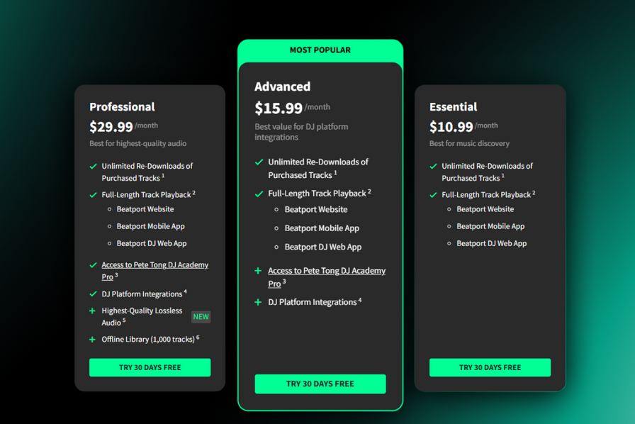 Beatport propose 3 abonnements différents : plus l’abonnement est élevé, plus il devient illimité et orienté DJ. Vous pouvez en essayer un, entièrement gratuitement pendant 30 jours, afin de déterminer lequel répond à vos besoins.