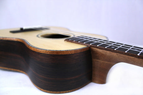 The tenor ukulele is the most commonly used model by professional musicians. Measuring 66 cm from the bottom of the body to the end of the neck, the tenor model offers more options due to its size. The tenor ukulele has a large body and thus a large resonance chamber which gives it a soft sound and, unlike the previously mentioned models, less sound from the strings being struck. The tenor ukulele is tuned: GCEA/ADF#H and with a length of approx. 66 cm, it has a sound very similar to a Spanish/classical guitar.