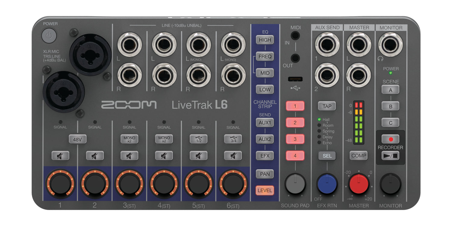 Présentez le centre de vos projets créatifs – LiveTrak L6. Ce puissant mixeur numérique 10 pistes et enregistreur de ZOOM combine portabilité et fonctionnalités professionnelles, ce qui le rend parfait pour les musiciens, les live-streamers et tous types de créateurs sonores. Malgré sa taille compacte, le L6 offre un son de qualité studio, plusieurs entrées, effets et connexion MIDI dans un appareil élégant.