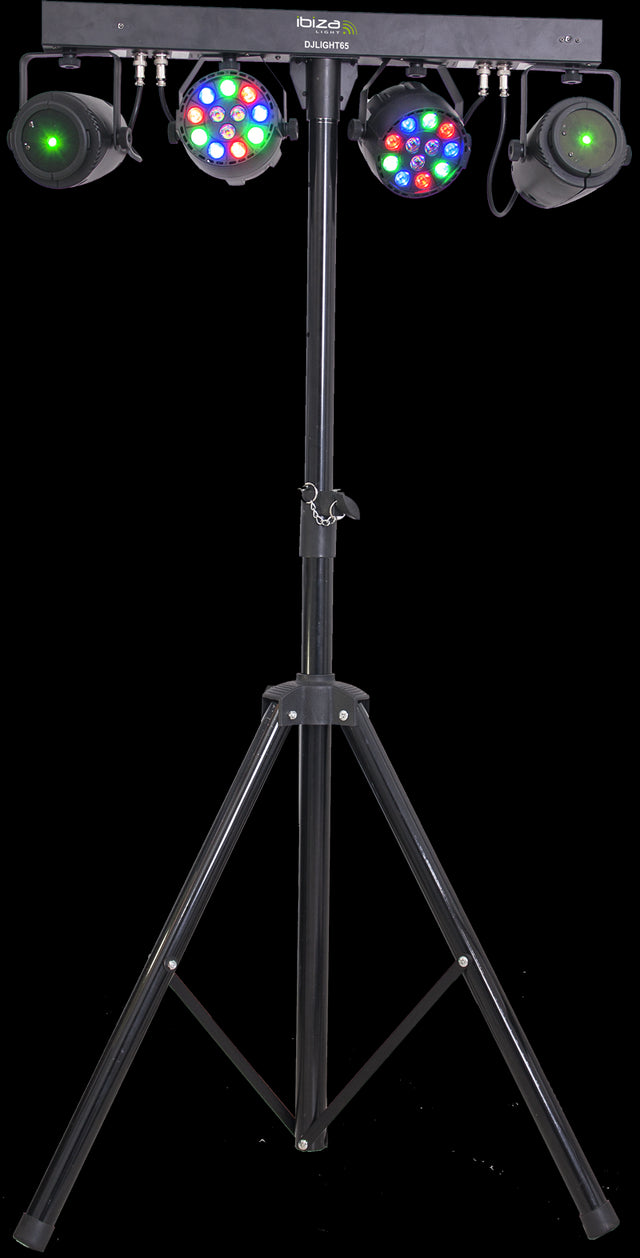 Barre lumineuse complète incluant un trépied antidérapant en finition noire pour un montage facile. Le kit comprend 2x projecteurs LED avec 12x 1W LED RGBW et 2x lasers de 130mW avec de magnifiques motifs d'étoiles en rouge et vert.