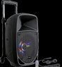 Haut-parleur alimenté par batterie avec unité de 8" et effet lumineux LED intégré Inclus un microphone. Joue via Bluetooth, micro USB, tuner FX ou entrée AUX. Poignée télescopique et roues.