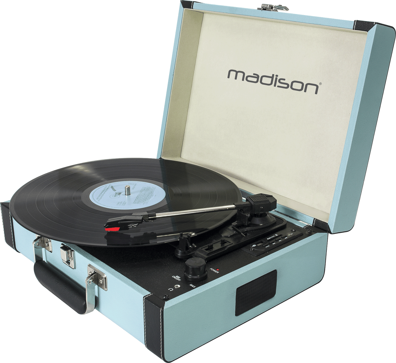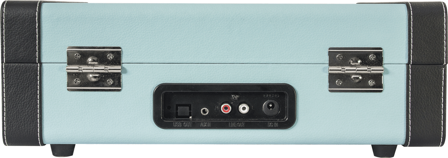 Cool lyseblå pladespiller i retrolook og kuffertdesign. Tag afspilleren med overalt. Indbyggede højttalere sikrer god lyd uden besvær. Afspil musik fra Bluetooth, USB og SD-kort - du går aldrig ned på musik. Optag dine LPer til USB og SD-kort, så du altid kan høre de sprøde toner fra vinylpladen. Udgang til hovedtelefoner. Afspilningshastighed 33/45/78 rpm.