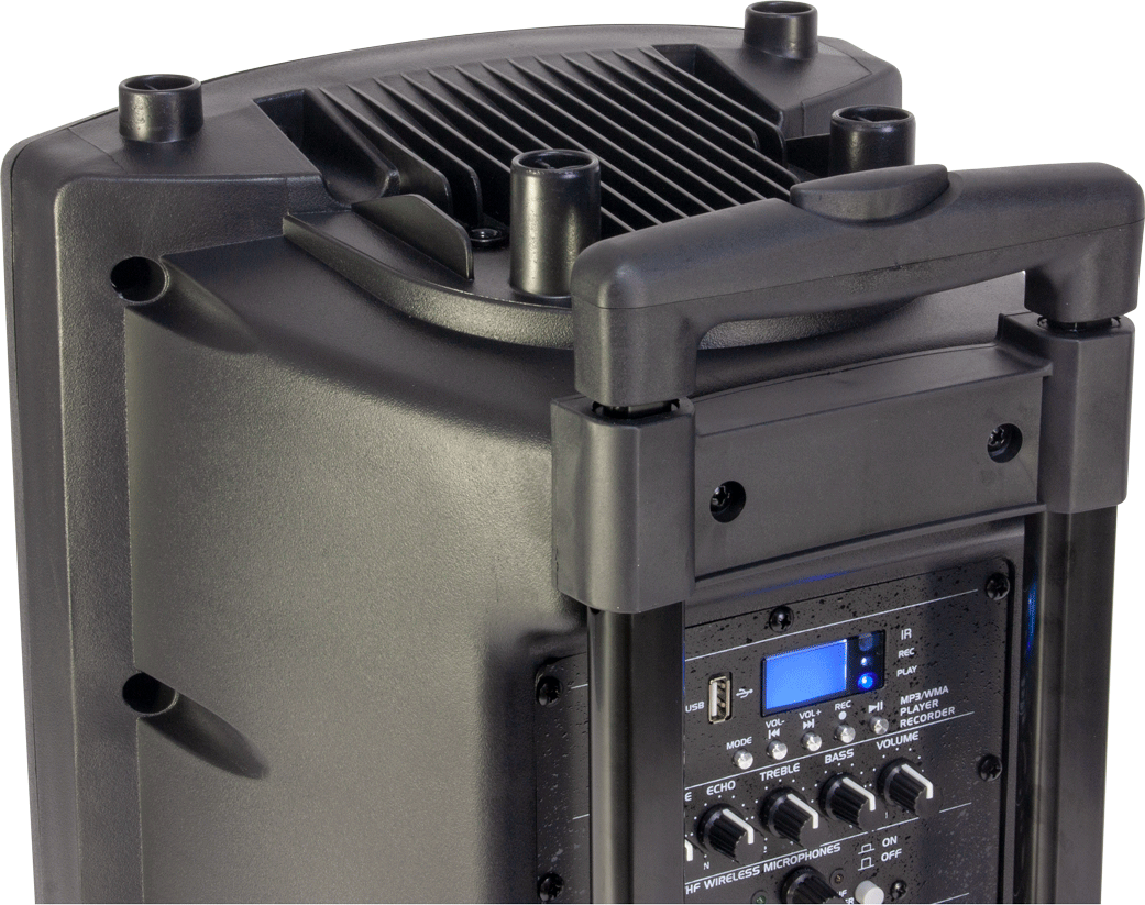 En plus de la qualité sonore extraordinaire par rapport à la catégorie de produit, ce système portable offre des fonctionnalités importantes telles qu'une batterie rechargeable incluse et une double alimentation (12V et 220V), une poignée et des roues.