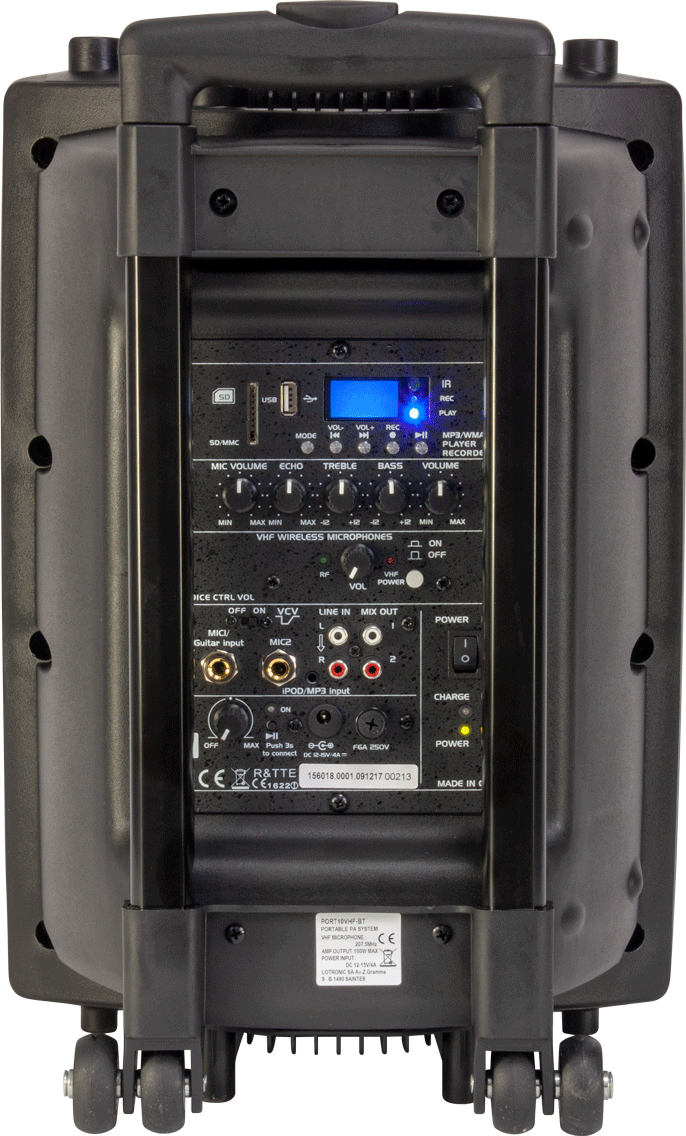 Il offre une totale liberté de mouvement dans n'importe quelle situation grâce au microphone VHF sans fil (portatif), à une télécommande et à diverses entrées et sorties adaptées à toutes sortes de sources, y compris les ports USB / MP3, SD / MMC et iPod.