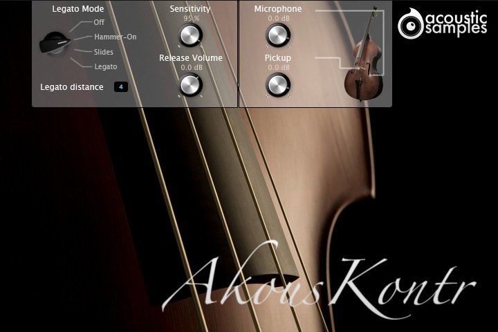 The AkousKontr is German 4/4 four strings Upright bass. Acoustic Samples recorded both pickups with a pair of Electrostatic Microphones.