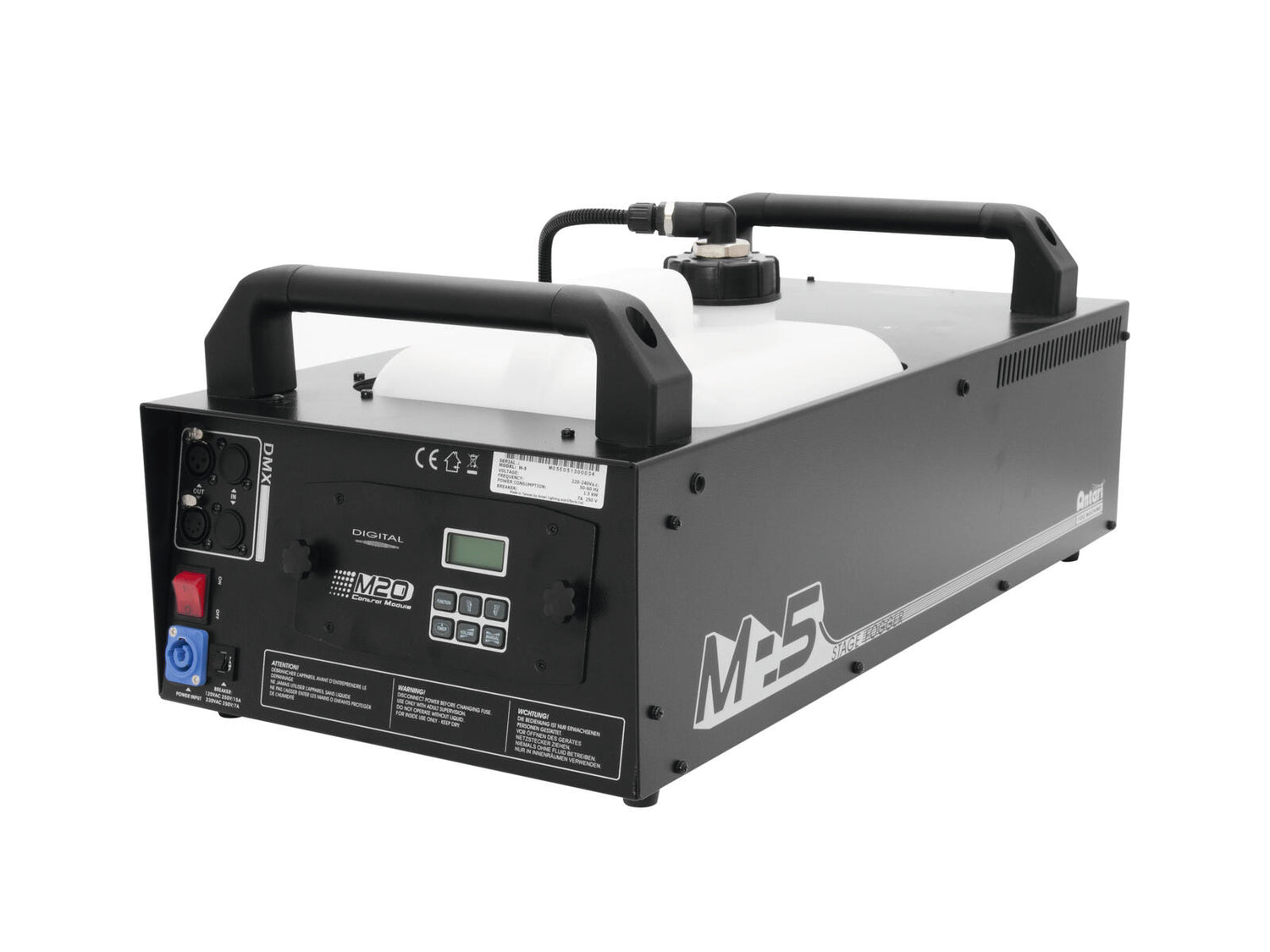 Maskinen leveres med Antari M-20 kontrolmodul, som giver adgang til timerfunktion, manuel aktivering, justering af output og DMX-startadresse. M-5 kan også styres via DMX eller udvides med trådløs fjernbetjening for ekstra fleksibilitet i både faste installationer og mobile produktioner.