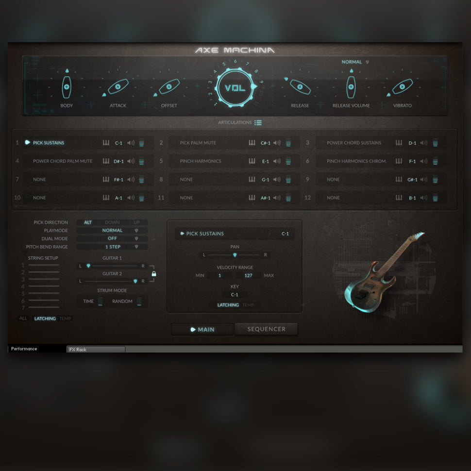Nous avons échantillonné des sustains de notes simples et d'accords puissants avec des variations de palm mute. Vous trouverez également un assortiment de SFX, comme des harmoniques pincées, des mutes, des grattages de médiators avec des variations lentes, moyennes et longues, du bruit de frettes, des choke, des rakes et des slides. Réglez votre tonalité de rêve en envoyant notre signal D.I. pur à travers vos plugins de simulateur d'ampli préférés, ou utilisez notre tonalité réamplifiée sur mesure, créée avec le logiciel Neural DSP. Notre interface graphique flexible vous donne accès à la sélection d'articulation en temps réel et aux fonctionnalités de performance, aux options de key-switch et de mapping, à l'arpeggiateur, à l'auto-strummer, au séquenceur et à un rack FX complet, le tout intégré dans une interface utilisateur intuitive et personnalisable.