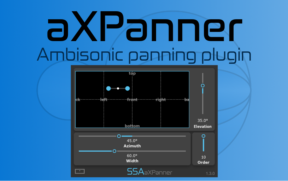 L'aXPanner est un encodeur Ambisonic qui vous donne le contrôle de l'azimut et de l'élévation de la source sonore, ainsi que de la largeur entre les canaux d'entrée stéréo. Le choix de deux interfaces (équirectangulaire et de haut en bas) vous permet de placer facilement votre son dans l'espace pour créer votre monde audio immersif. Il est disponible en trois variations : premier ordre, troisième ordre et dixième ordre.