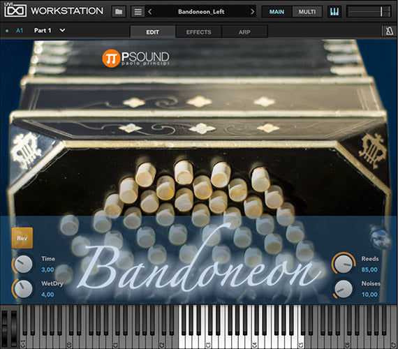Le Bandoneon consiste en une reproduction philologique d'un Bandoneon historique Alfred Arnold fabriqué en Allemagne dans les années 50 ! Son son typique est basé sur 2 anches (Zinc) pour chaque note. Le PSound Bandoneon a été échantillonné en 4 couches avec 2 round robin pour un total de 440 échantillons (1 Go de stockage)