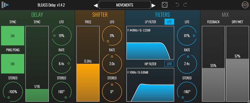 BLEASS Delay comprend également trois LFO, un pour le moteur de délai, un pour le décalage de fréquence et un pour le filtre. En plus de permettre au plugin de créer des effets de modulation classiques tels que le chorus et le flanging, les LFO dédiés sont idéaux pour créer des effets sonores excitants et des paysages sonores épiques en constante évolution.