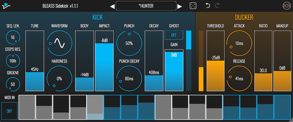 BLEASS Sidekick est un plugin polyvalent combinant un synthétiseur de grosse caisse, un séquenceur à 16 étapes et un ducker pour des effets de sidechain dynamiques.