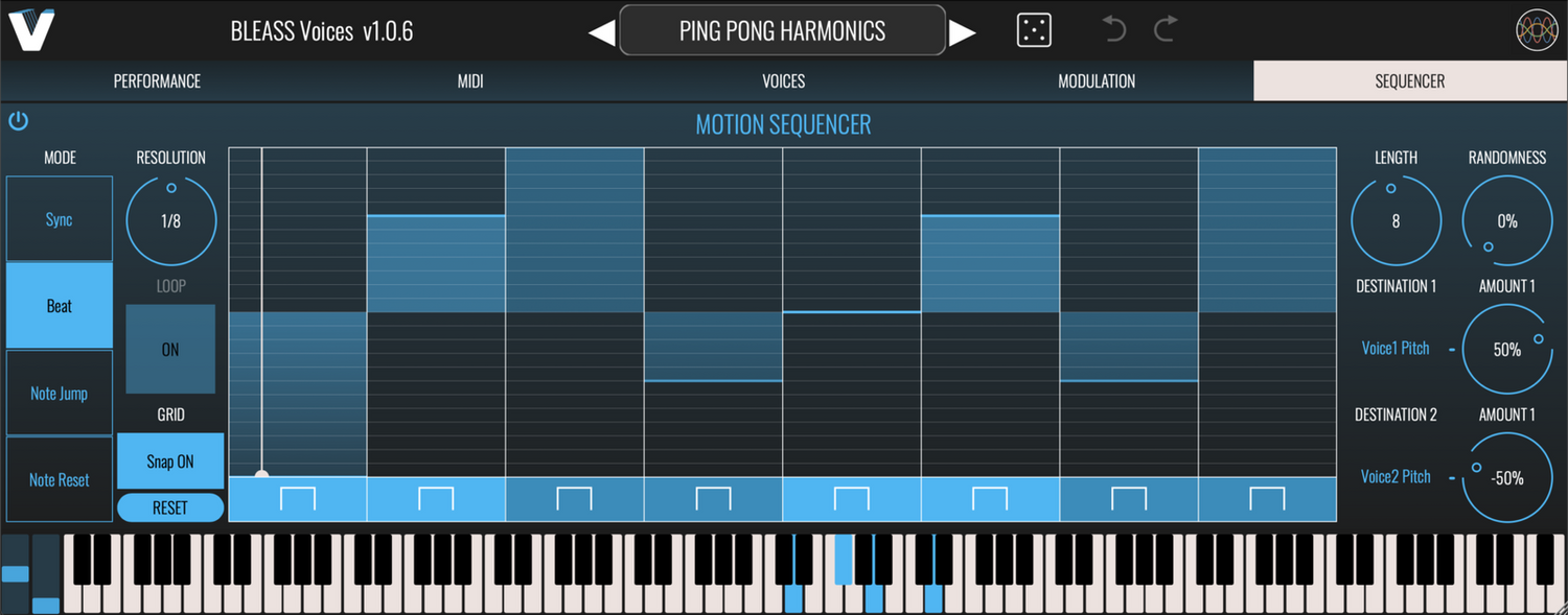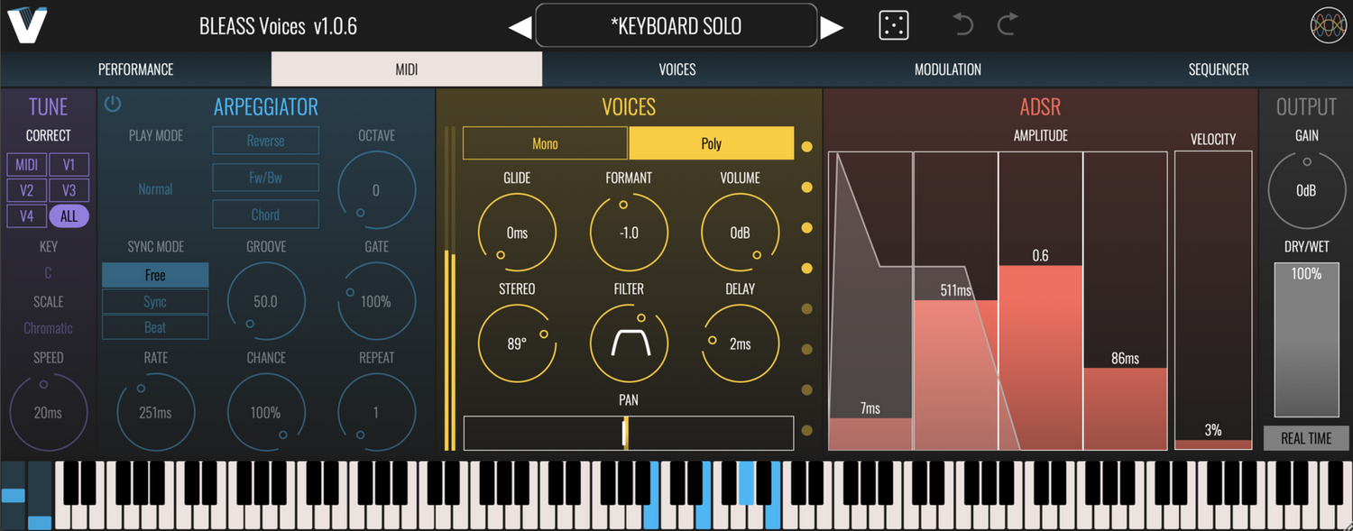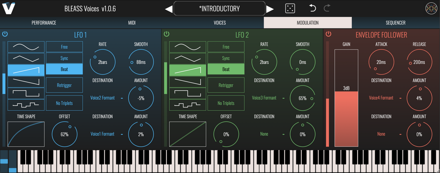 Quatre voix peuvent être transposées indépendamment de ±1 octave ou aplaties à un pitch choisi, tandis que huit sont déclenchées par MIDI, correspondant aux notes entrantes. Un support MPE profond permet des accords vocaux expressifs et des solos avec des glissandos et des trilles réalistes. Des modulateurs de style synthétiseur, y compris deux LFOs, un suiveur d'enveloppe et un séquenceur de motifs, ajoutent une variation dynamique.