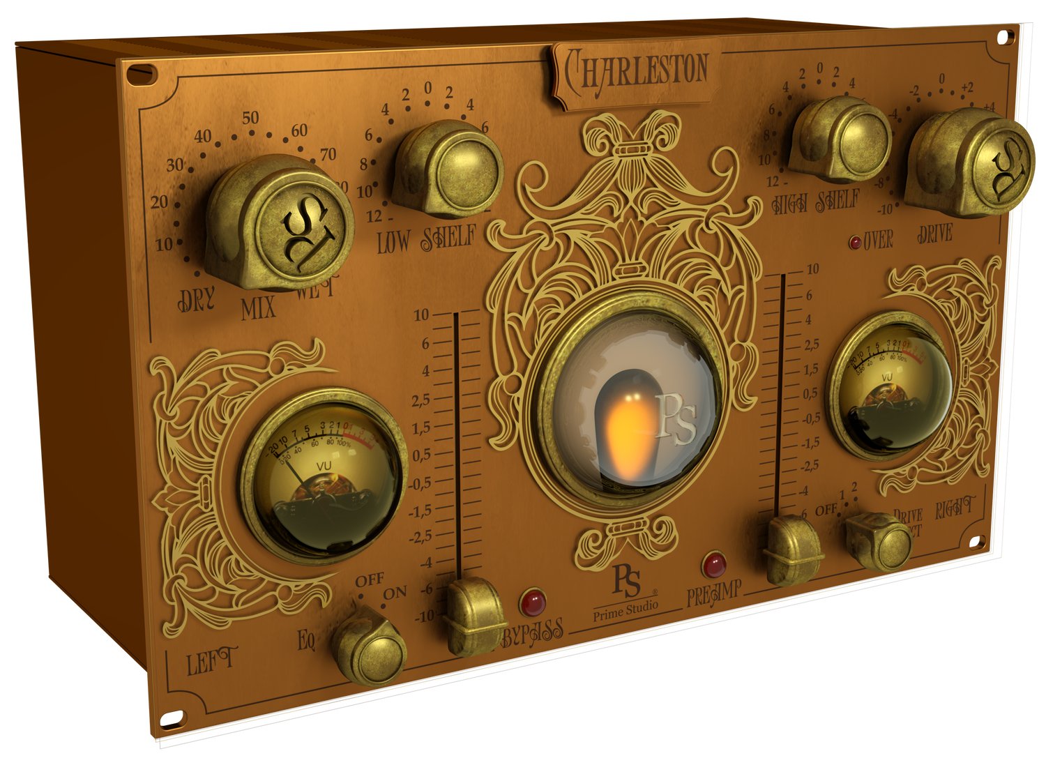 Êtes-vous prêt à rencontrer le cousin de Charly ? Prime Studio® Charleston est un appareil de summing basé sur une variété d'appareils analogiques utilisés quotidiennement comme une configuration patchée au Prime Studio®. Les égaliseurs à basse et à haute fréquence peuvent être ajustés selon vos désirs pour donner à vos pistes une touche douce. Choisissez parmi deux sons de „drive“ différents et mélangez la distorsion harmonique avec le bouton Mix pour correspondre au signal original. Le son du préampli peut également être désactivé pour rendre le summing de vos pistes encore plus flexible. L'Œil Magique vous montre à quel point l'intensité de l'effet est réglée, et la LED Over indique si votre signal d'entrée est trop fort. Deux faders séparés pour peaufiner les canaux gauche et droit complètent le plug-in.