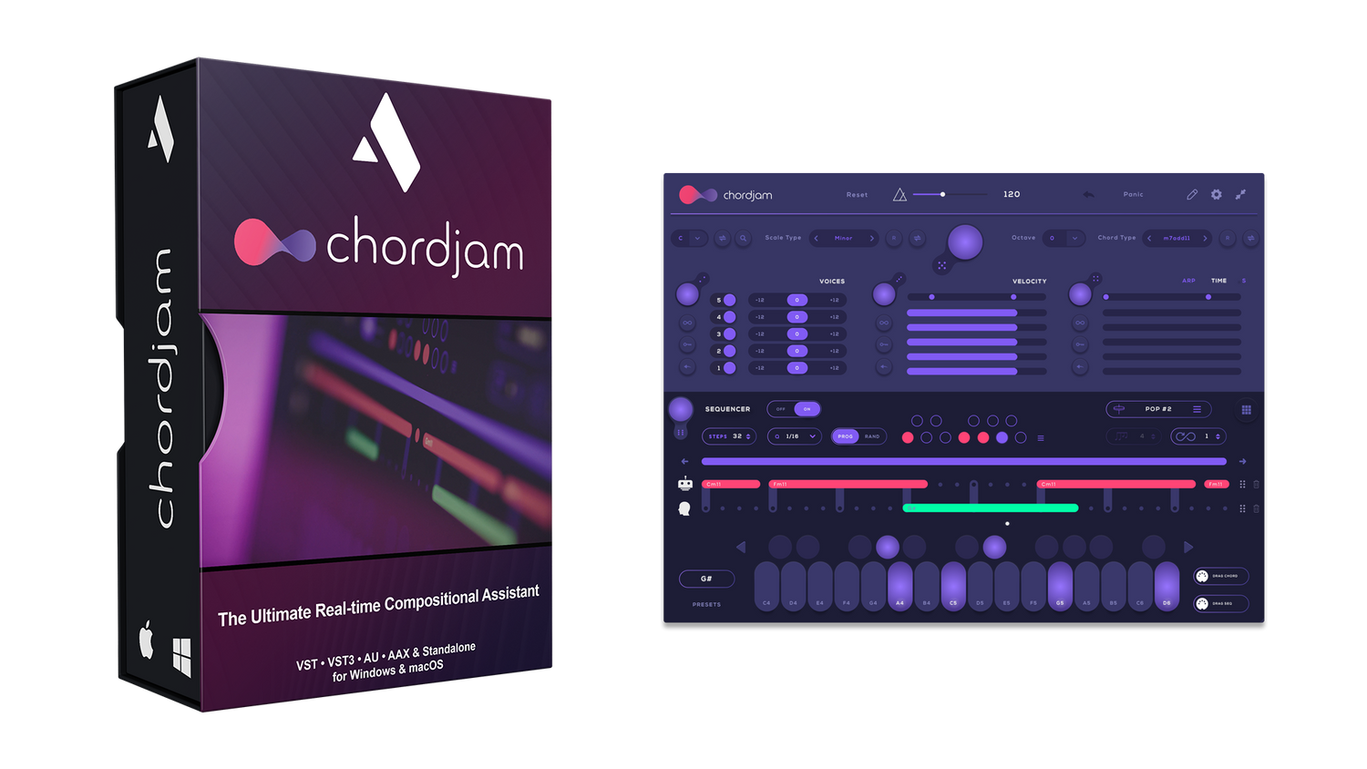 Chordjam est un plug-in innovant et une application autonome qui crée des accords et des progressions grâce à une randomisation intuitive contrôlée par l’utilisateur.