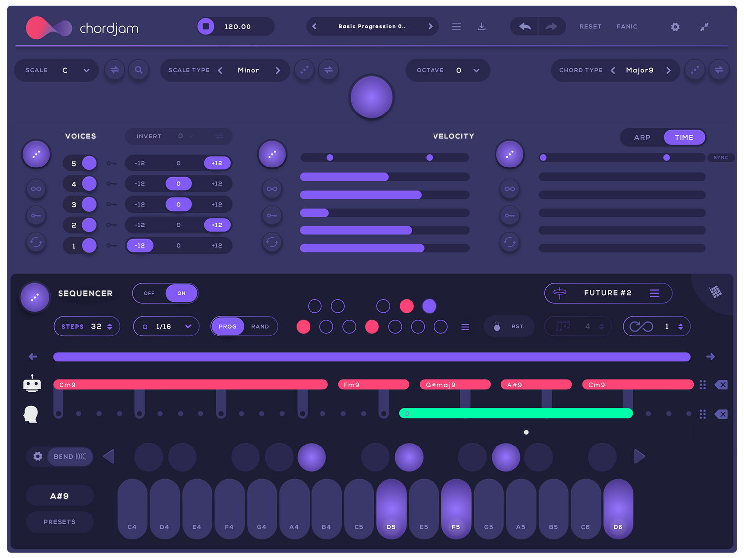 Les utilisateurs peuvent choisir parmi une variété de types de gammes et d’accords, de paramètres de voicing, ainsi que des rythmes et des progressions, ou laisser son puissant séquenceur générer un nombre incalculable de progressions à partir de n’importe quelle combinaison de réglages, pour offrir des variations imprévisibles mais toujours musicales...