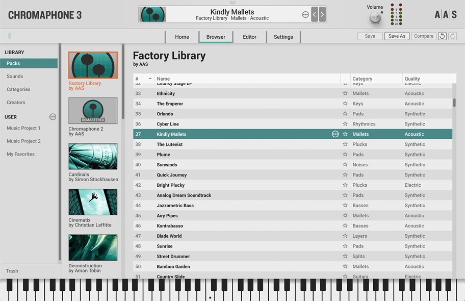 Chromaphone 3 er en to-stemmig synthesizer baseret på otte fysisk modellerede akustiske resonatorer. Dette alsidige instrument tilbyder en dejlig blanding af virkelighedsnær tilstedeværelse og karakteristiske klangfarver, der ikke kan findes andre steder. Chromaphone 3 leveres med over 1000 presets, der udnytter dets avancerede akustiske objekt-syntese fuldt ud.