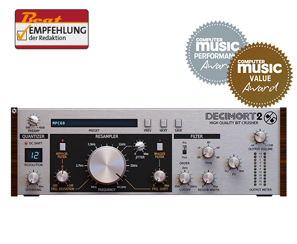 Bit crusher de qualité premium avec des algorithmes de traitement du signal complexes et avancés au sein de Decimort simulant le comportement de l'ensemble du chemin d'échantillonnage qui existe dans chaque convertisseur AD/DA.