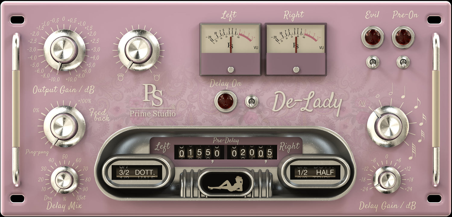 De-Lady combine le son de notre célèbre outil de sommation Charly Triple Six Limited, basé sur un dispositif de sommation à tube analogique fortement modifié selon nos spécifications et un effet de délai stéréo simple offrant une fonctionnalité typique. Façonnez vos mixages en ajoutant du délai avec un punch de tube fin et une distorsion harmonique apaisante en activant la scène « Evil », en réglant des sons allant de doux comme le paradis à des sons lourds et torrides.