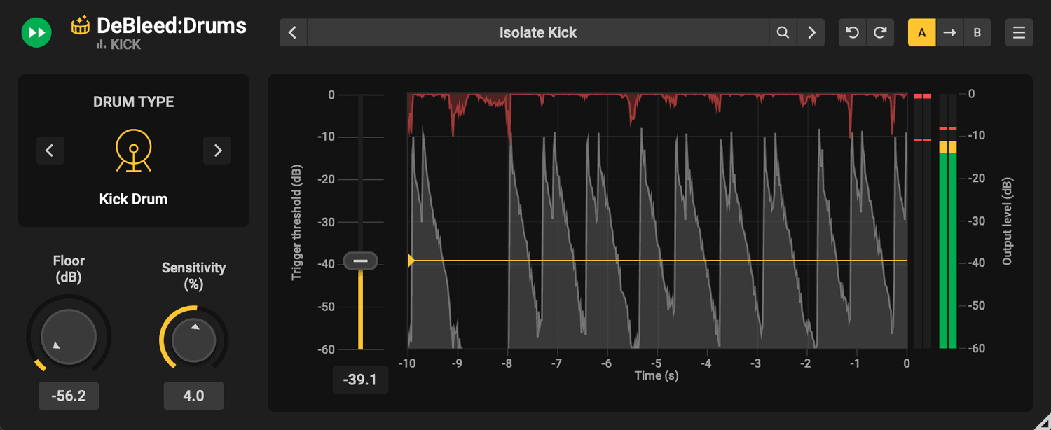 Pour des résultats optimaux, DeBleed:Drums utilise la technologie des réseaux neuronaux pour séparer les éléments du kit de batterie, comme les grosses caisses et les caisses claires, tandis que les algorithmes DSP protègent les transitoires pour plus de clarté. Sa logique de déclenchement intelligente fixe des seuils pour supprimer efficacement le bleed, offrant un mixage de batterie plus propre et plus naturel.