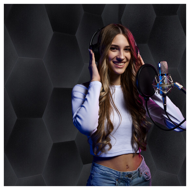 Den dekorative hexagon-form giver et stilrent og moderne look, som samtidig forbedrer lydmiljøet. Panelerne absorberer lydrefleksioner og bidrager til klarere tale, bedre optagelser og en mere behagelig lytteoplevelse.