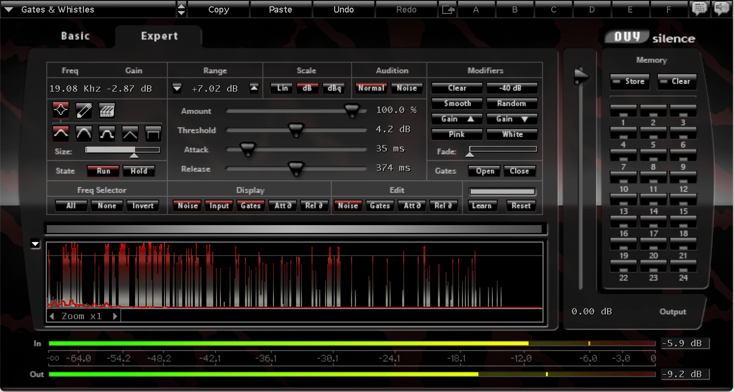 The painstaking and laborious task of removing noise has now becomes a highly efficient and stressfree task. Take for example an old recorded track… With Duy Silence, simply analyze the noise on it, set the attack, release and threshold values, and you’re done!! For greater control, you can go into the "Advanced" mode, which enables you to change the noise gate settings for each one of the over 1000 frequency bands created within DUY Silence.
