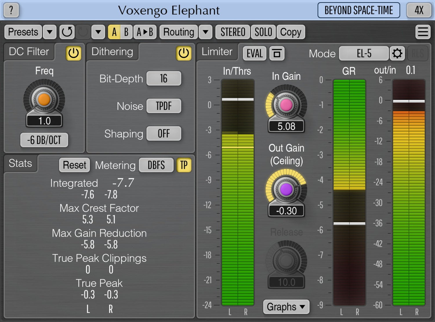 Elephant, qui intègre également un filtre DC offset et un convertisseur de profondeur de bits haute qualité avec noise-shaping optionnel, vous permet de finaliser vos productions musicales et audio avec une touche en plus !