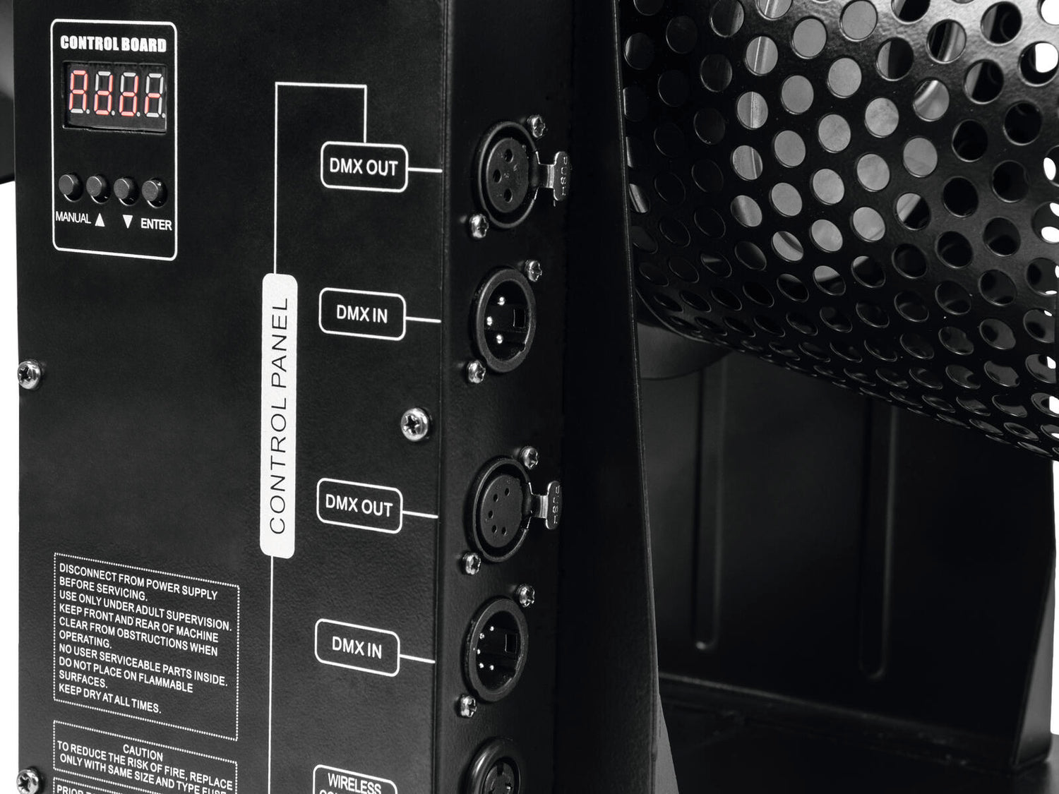La machine peut être contrôlée via DMX, télécommande sans fil ou en mode autonome, et elle est compatible avec des software comme Light´J, LED PC-Control 512 et Light Captain.