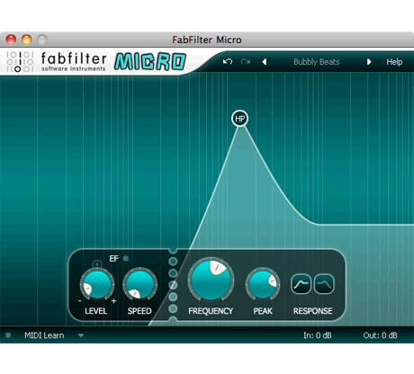 Le filtre unique de FabFilter Micro est lisse et crémeux, mais se transforme facilement en saturation brute et en auto-oscillation lorsqu'il est ajusté à l'aide de l'affichage de filtre interactif. Il dispose de formes passe-bas et passe-haut ainsi que d'un suiveur d'enveloppe pour moduler la fréquence de coupure.