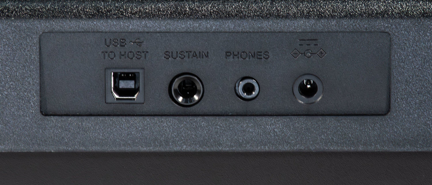 The keyboard has a clear LCD display, and the convenient connections include USB-B to host, sustain pedal, headphone output, and power input. The smart carrying handle integrated into the cabinet makes it easy to transport. Additionally, the keyboard can run on 6 AA batteries (not included), so you can play anywhere.