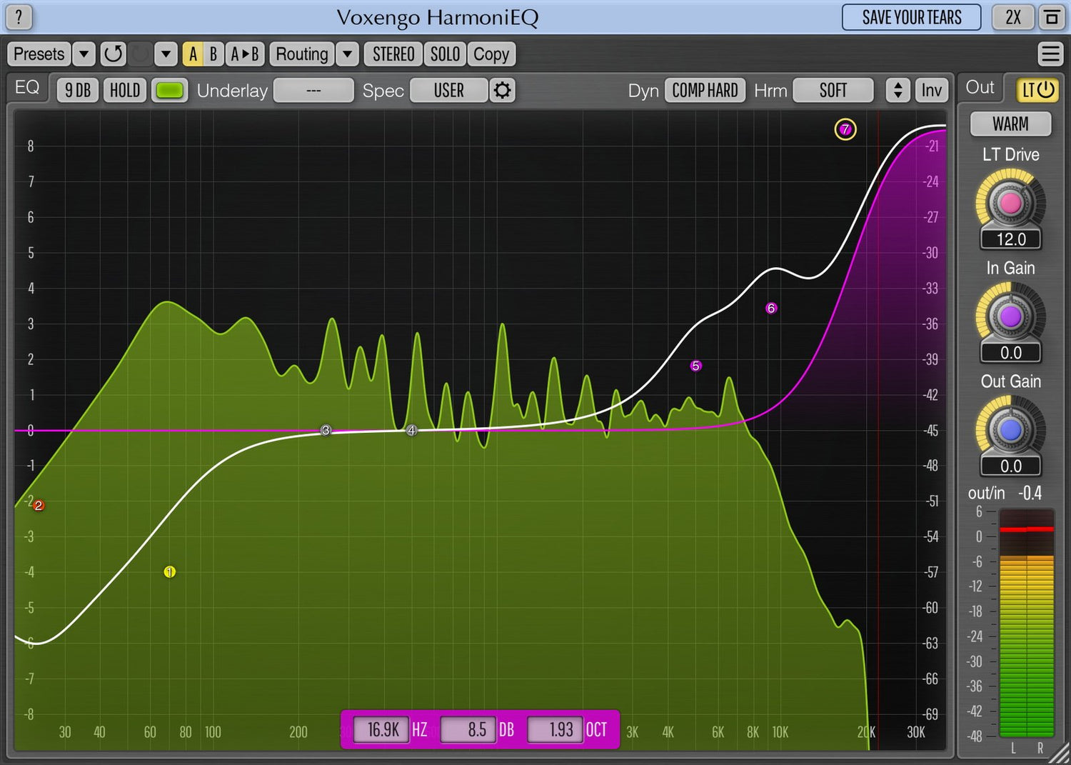 Another useful element of HarmoniEQ is its control surface's frequency range which goes up to 38 kHz. Such extended range allows you to make smooth “air” boosts easily. While HarmoniEQ is best suited for EQ boosts, its EQ cuts also sound great.
