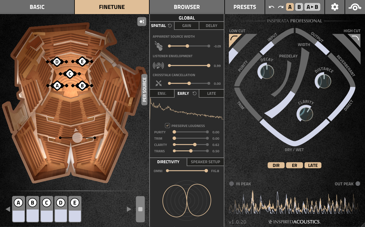 Dans INSPIRATA, nous vous permettons de contrôler des paramètres qui comptent vraiment pour vos oreilles - vous pouvez ajuster directement l'acoustique et le son de l'espace au lieu des propriétés indirectes qui n'ont aucun impact sur le son. Fini le temps où vous deviez vous soucier de la taille de la salle, de la diffusion des murs ou de la décohérence juste pour obtenir des résultats différents dans chaque espace. Vous avez maintenant un contrôle total et indépendant sur la largeur de votre source sonore dans l'espace, combien de son mélangé vous atteint, et combien il vous enveloppe autour des oreilles. Les paramètres acoustiques spatiaux tels que la largeur apparente de la source sonore (ASW) et l'enveloppement de l'auditeur (LEV) sont contrôlables pour la première fois directement dans n'importe quelle solution de réverbération. En plus de ces contrôles révolutionnaires, vous pouvez également ajuster l'orientation de vos sorties de haut-parleurs dans l'espace - orientant votre configuration stéréo ou surround dans n'importe quelle direction. Et vous pouvez changer et automatiser tout cela en temps réel.