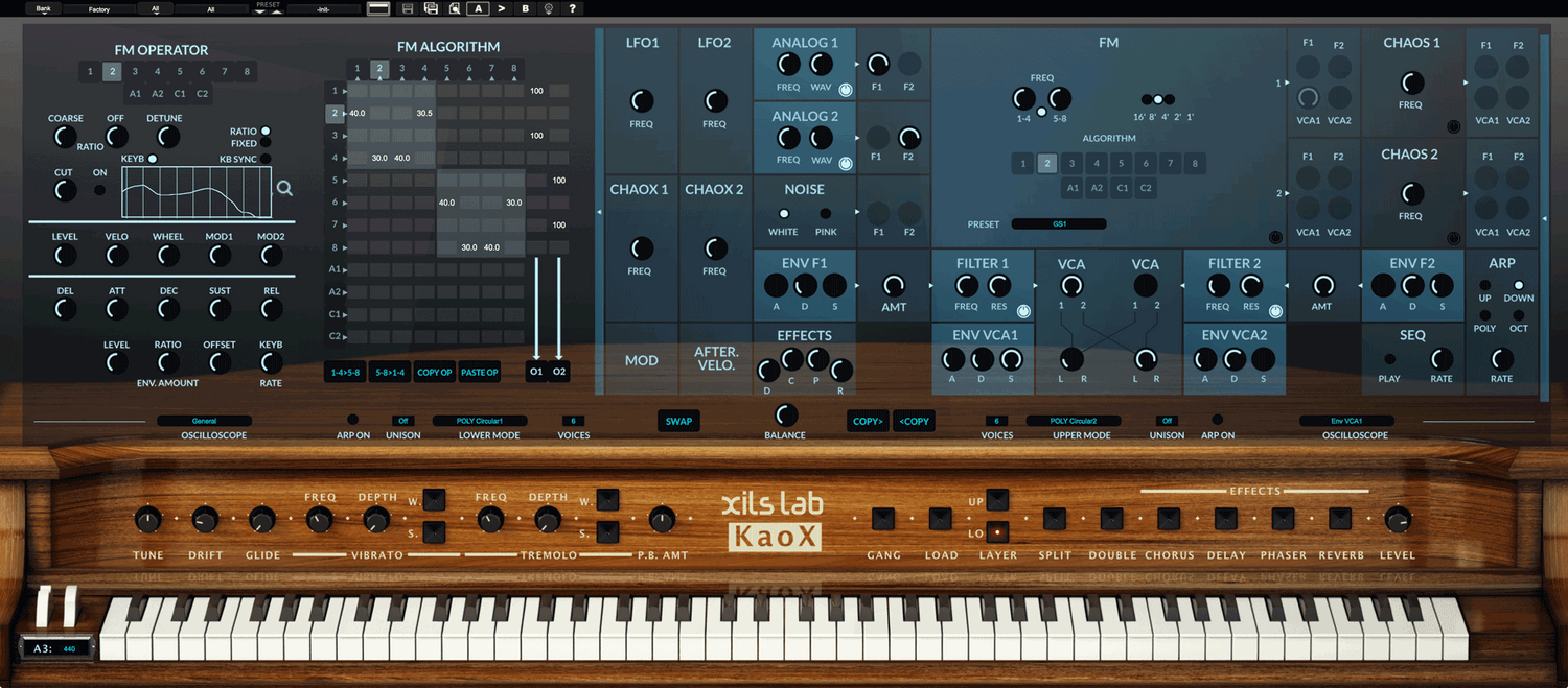 With 8 operators, 2 outputs, 2 banks with independent pitch, and improved FM algorithms, XILS-lab has elevated the FM synthesis to a new level.