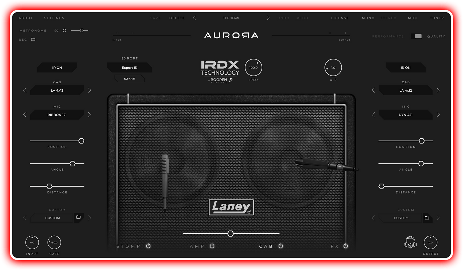 Avec le IRONHEART-PLUGIN, vous avez le choix entre 2 cabinets exceptionnels de la gamme Laney, divers modèles de micros à choisir, un chargeur IR externe, et un bouton AIR pour une présence supplémentaire.