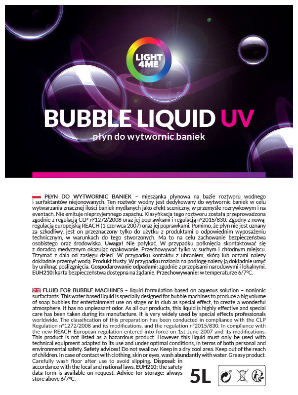 Liquid made in France Made in Europe by the worlds leading liquid manufacturer. LIGHT4ME BUBBLE FLUID UV 5L is a professional, odorless and very efficient UV liquid for bubble machines created on the basis of a mixture of pure water and nonionic surfactants. The solution is widely used, especially in the entertainment industry. It can be used to create stage effects during performances and various types of events. The bubbles created from it have a strong structure, are light and stay in the air for a long time, and the light going through them causes their luminescence. Ultraviolet liquid for bubbles by Light4Me is particularly recommended for animators of games and entertainment for children, carnivals, companies organizing various types of events, as well as individuals. Technical specification Type bubble liquid Capacity 5L Container dimensions 19 x 28 x 13 cm Weight 5.1 kg