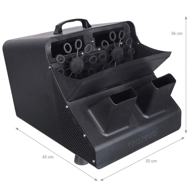 Efficient bubble machineLIGHT4ME BUBBLE BIG is a very powerful bubble generator controlled with a wireless remote, featuring two bubble emitters and two bubble blowers. It is an excellent work tool for mobile DJ, event team, entertainers and companies organizing various types of entertainment events. The device provides great fun especially for children, but it also works well for weddings, proms, 18th birthday parties and various types of special events and parties.IncludedLIGHT4ME Bubble Big bubble machineintegrated power cablewireless remoteuser manualnbsp Bubble generator for DJ, band and event companyLIGHT4ME Bubble Big, with its lightweight housing and comfortable handle, is the perfect bubble machine for a mobile DJ, band or event company. With a wireless remote, it can operate anywhere. The bubbles can be blown up to 6 meters and fall on the party participants, creating an interesting effect and unique atmosphere. The large capacity of the liquid tank allows for very long, uninterrupted operation of the device. LIGHT4ME Bubble Big is a solidly made, very efficient and, by the way, also relatively inexpensive bubble generator, available at the best price specially prepared by our store!nbspTechnical specificationPower supply AC90220V, 5060 HzPower 300WTurbines 2Control wireless remoteRemote control range 10 mLiquid tank capacity 2.5 LEmission distance 4 6 mHousing material plasticCooling fanbasedDevice dimensions 45 x 36 x 35 cmPackaging dimensions 56 x 40.5 x 42.5 cmNet weight 3.8 kgGross weight 5 kgOriginal packaging and filling.