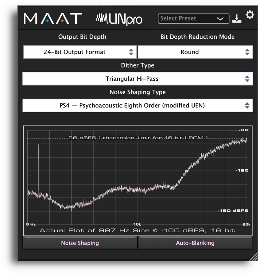 Partageant la même interface utilisateur, la famille LIN à deux canaux et multicanaux de MAAT est votre dernier lien entre la production et la livraison. Offrant une réduction de la longueur des mots en option et sept spectres de modelage du bruit adaptés à la livraison analogique et numérique des actifs, LIN est hautement ajustable pour vous aider à créer votre propre "son" signature. En plus du TPD et du TPD pondéré, LINpro et LINSurround proposent quatre choix de modelage du bruit psychoacoustique nouvellement développés de cinquième, huitième et neuvième ordre. Comme pour tous les mécanismes de dithering, LIN doit être la toute dernière instance de plug-in, juste avant de convertir au format final à point fixe.