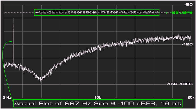 LINpro apporte une certitude visuelle à l'art ésotérique du dithering. Nous avons inclus des graphiques du monde réel de chaque forme de bruit pour votre plaisir visuel. Ce ne sont pas des simulations MATLAB, ce sont de véritables graphiques générés par le moteur de dithering optimisé de LINpro. Remarquez que le signal d'entrée à -100dBFS, ce pic sur le côté gauche du graphique, est préservé même si la longueur des mots a été réduite à 16 bits. Un mot de 16 bits ne peut encoder ou stocker que 96dB de plage dynamique. Toute information plus silencieuse que -96dBFS devrait être perdue lors de la réduction de la longueur des mots à 16 bits. Avec LIN, jusqu'au 19ème bit du signal d'entrée est préservé, intégré dans le mot de 16 bits résultant.