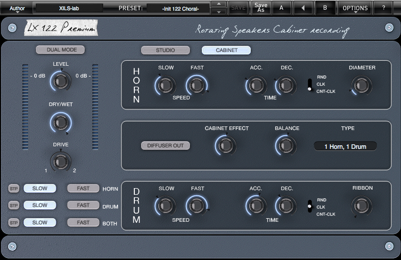 The internal cabinet reflections, which give the Leslie its famous mellow sound, are also emulated but with the unique added possibility of increasing or decreasing the reflections. So you can go from the standard closed cabinet to rotating speakers without any cabinet at all.