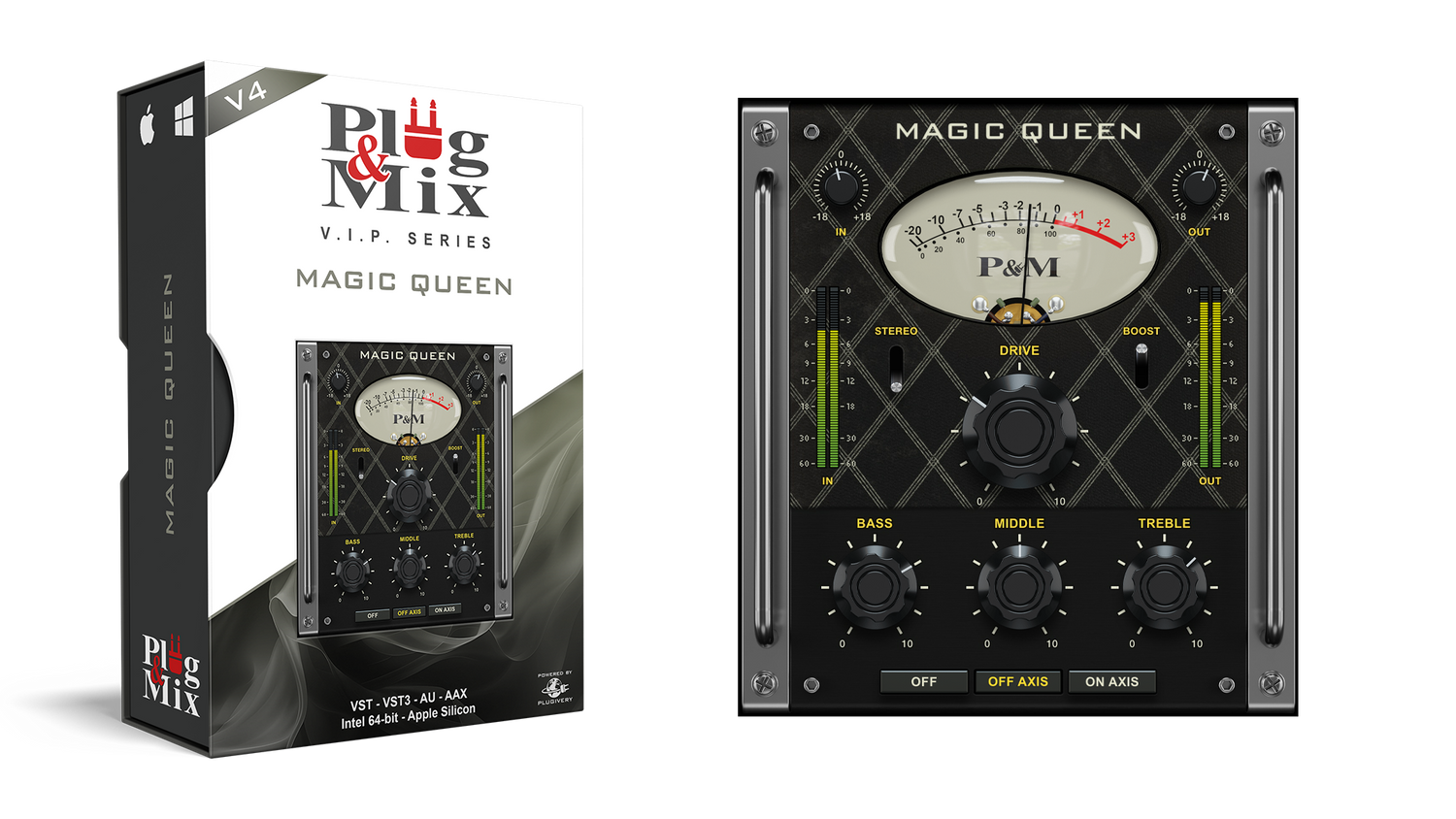 Channel the legendary tones of classic British amps with Magic Queen, a plugin inspired by the bright, jangly sounds of the Vox AC30. Tweak Drive, Bass, Middle, and Treble to sculpt your perfect tone, and select from speaker emulation options for added authenticity.