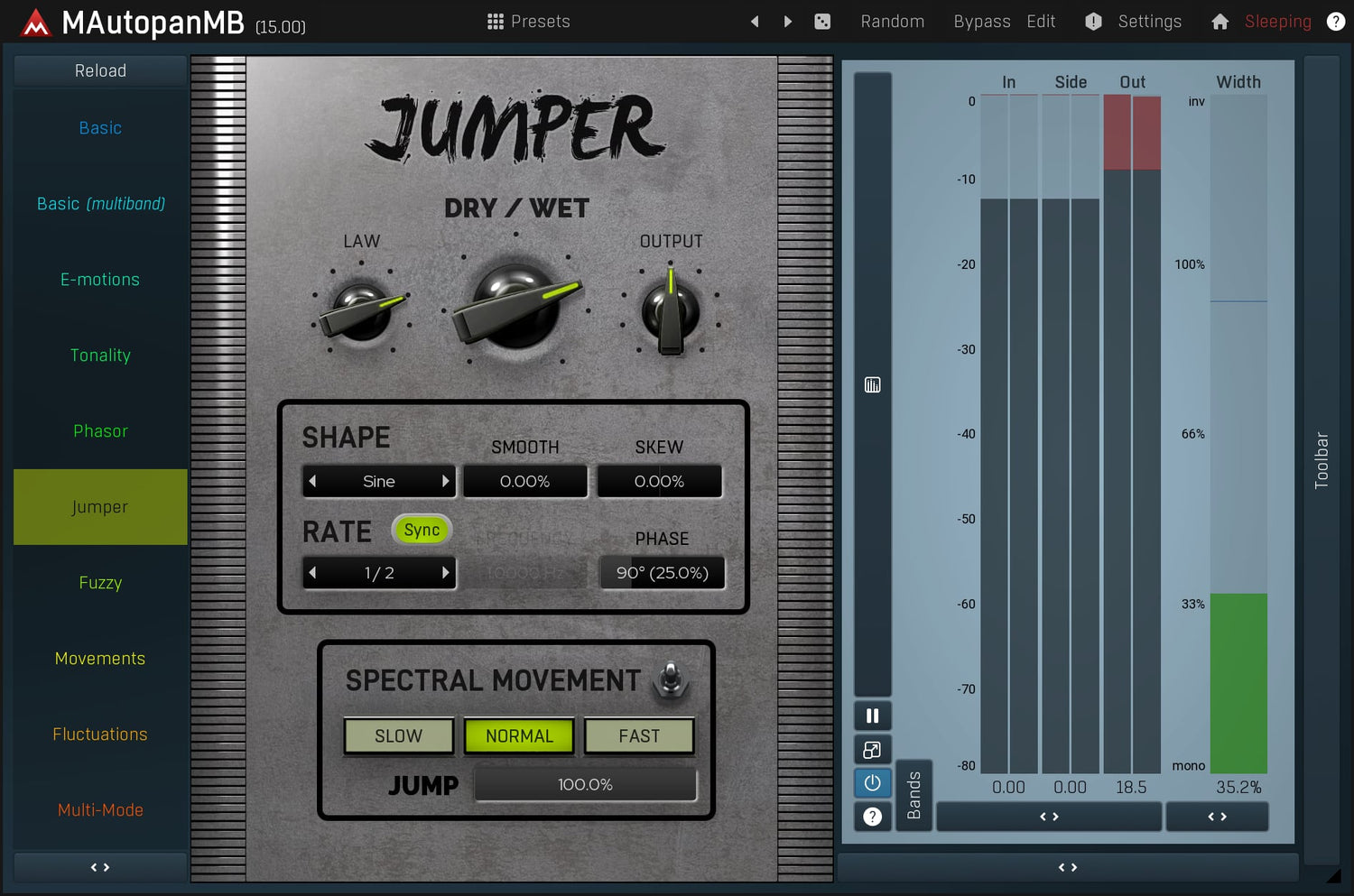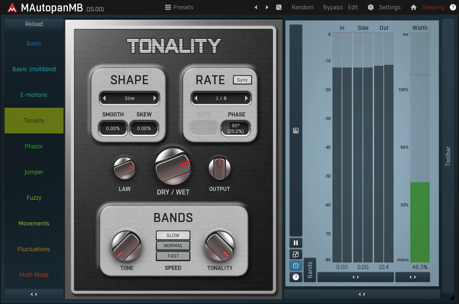 MAutopanMB, the most powerful automatic panner in the world, is the cure whenever you need to make some audio material more spatial and less static. It's an indispensable tool for keyboards, guitars and many other mono instruments.