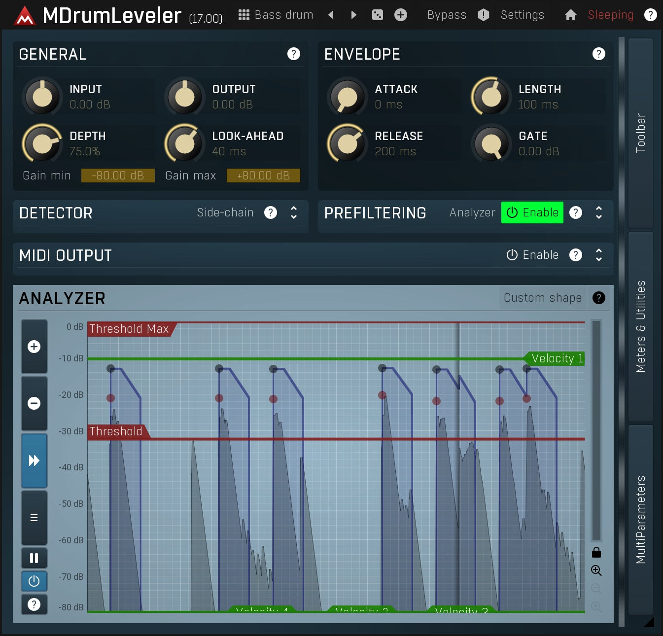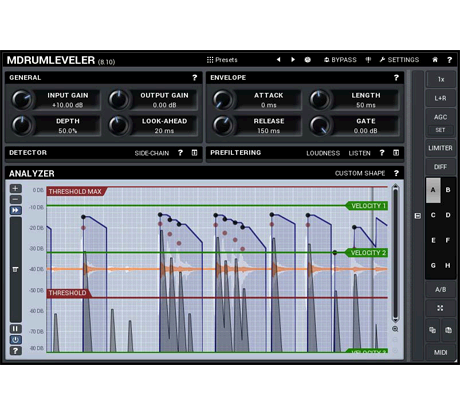 MDrumLeveler vous permet de façonner l'enveloppe de chaque frappe de batterie. Que vous souhaitiez un corps plus long ou un relâchement plus rapide, cela ne pose aucun problème pour MDrumLeveler. Et vous n'avez pas besoin de passer des heures à expérimenter, MDrumLeveler vous donne un contrôle direct sur ces paramètres.