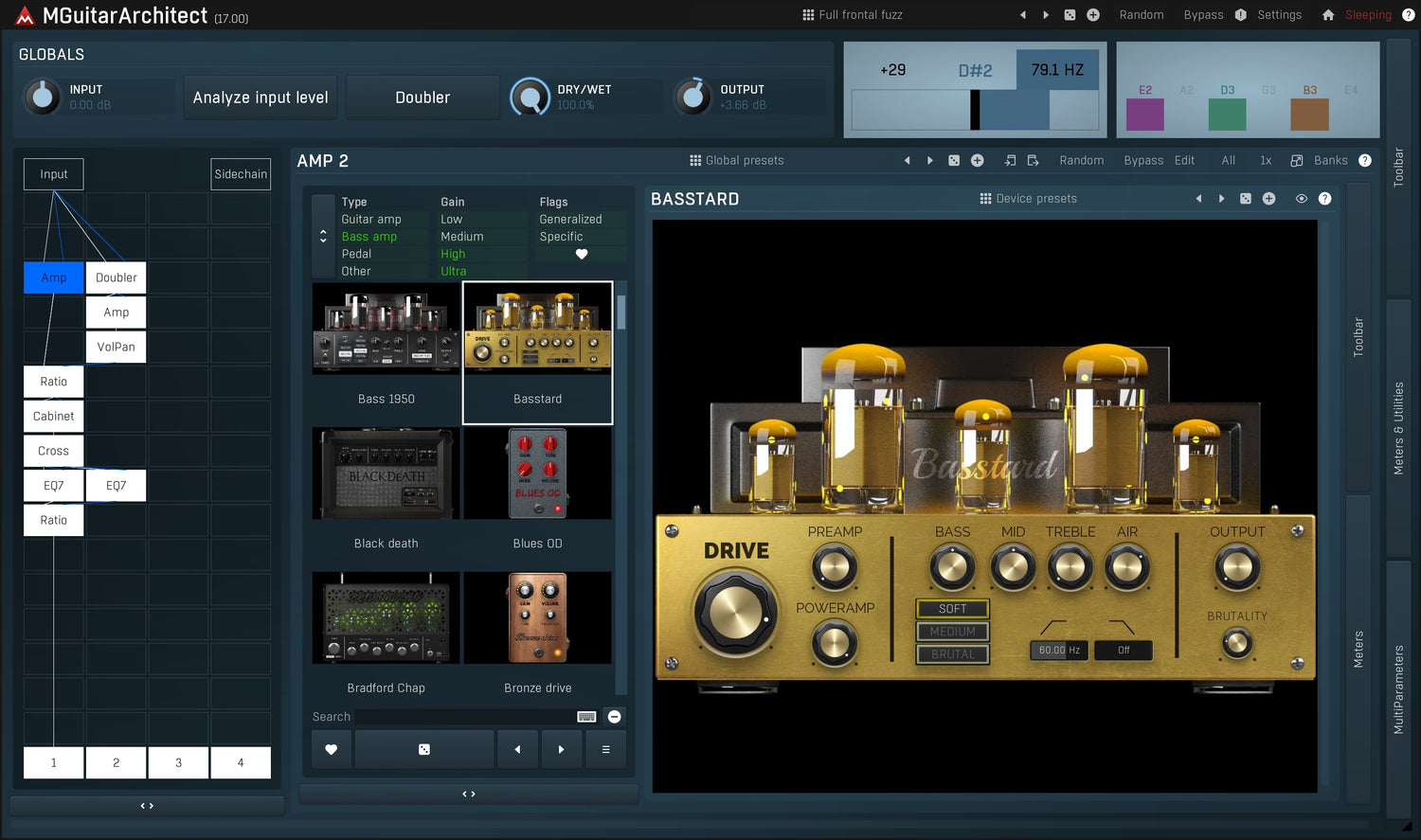 Il y a des centaines d'effets parmi lesquels choisir, et ils sont tous classés par catégorie et par nom. Une fois que vous en sélectionnez un, il y aura une interface interactive que vous pourrez manipuler pour obtenir les meilleurs résultats. Vous avez un contrôle total sur tous les paramètres de chaque ampli, cabine, stompbox ou tout autre effet que vous choisissez. Chacun d'eux est également accompagné de presets variés pour une personnalisation rapide. Vous pouvez même enregistrer vos propres presets pour chaque effet ou même chaque chaîne.