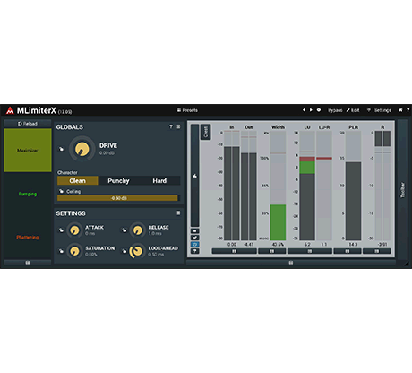 MLimiterX dispose de notre magnifique système de saturation, qui peut donner un caractère analogue agréable à votre musique et même la rendre plus forte !