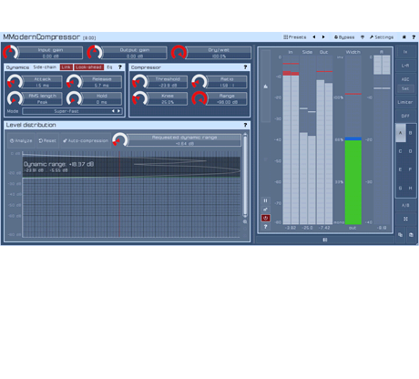 MModernCompressor fournit bien sûr les paramètres de contrôle typiques, la réduction de gain, le pic de sortie et les valeurs de loudness, mais il affiche également un graphique de distribution des niveaux, à partir duquel le plugin peut analyser le signal et configurer automatiquement les paramètres du compresseur !