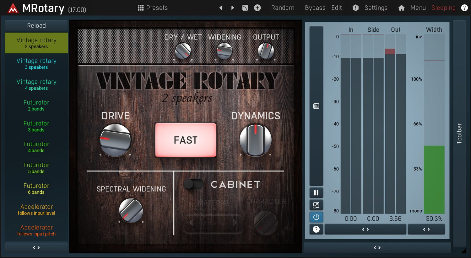 MRotary est le simulateur rotatif ultime, capable de délivrer non seulement un excellent son vintage, mais aussi un son algorithmique futuriste avec jusqu'à 6 haut-parleurs à la fois. Vous pouvez concevoir votre propre cabinet en utilisant n'importe quel matériau, du bois au verre, traiter le signal rotatif à l'aide d'un égaliseur dynamique complet et bien plus encore.