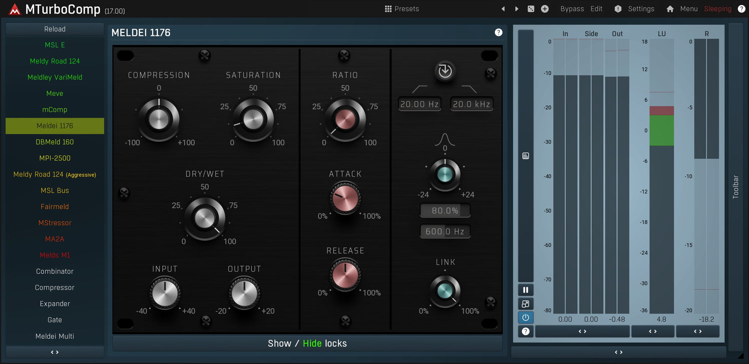 Nous avons donc pris la liberté de définir une nouvelle norme. Tous les compresseurs que MTurboComp émule ont presque la même interface graphique, afin que vous sachiez toujours quoi faire. Ils ont les contrôles que les originaux avaient, mais ils en ont bien plus : Compression pour contrôler la quantité de compression avec un minimum de changements au niveau de sortie, Saturation pour obtenir un caractère supplémentaire, contrôle Dry/wet pour la compression parallèle, et enfin, entrée side-chain, détecteur passe-haut, passe-bas et filtres de crête, afin que vous puissiez facilement régler le compresseur à votre matériel audio. Les classiques de Melda tels que la compensation automatique de gain, le limiteur de sécurité, le traitement mid/side et les instantanés A-H sont bien sûr inclus.